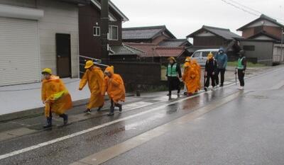 風雨の中の集団登校